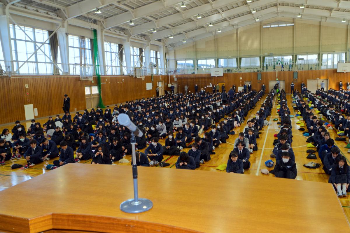 テスト後のホームルームを経て、午後は全校での「大掃除」から再始動。校内を清めたのち、全校生徒が体育館に集まり、新年最初の集会が行われました。